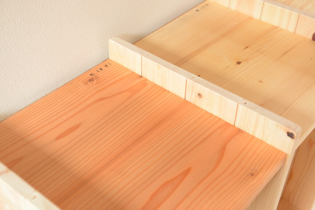 保育園の什器を製作しました。什器の上部の板は様々な樹種を使用し、樹種による色の違いを子どもたちに感じてもらえる様にしました。樹種名も記載しています。