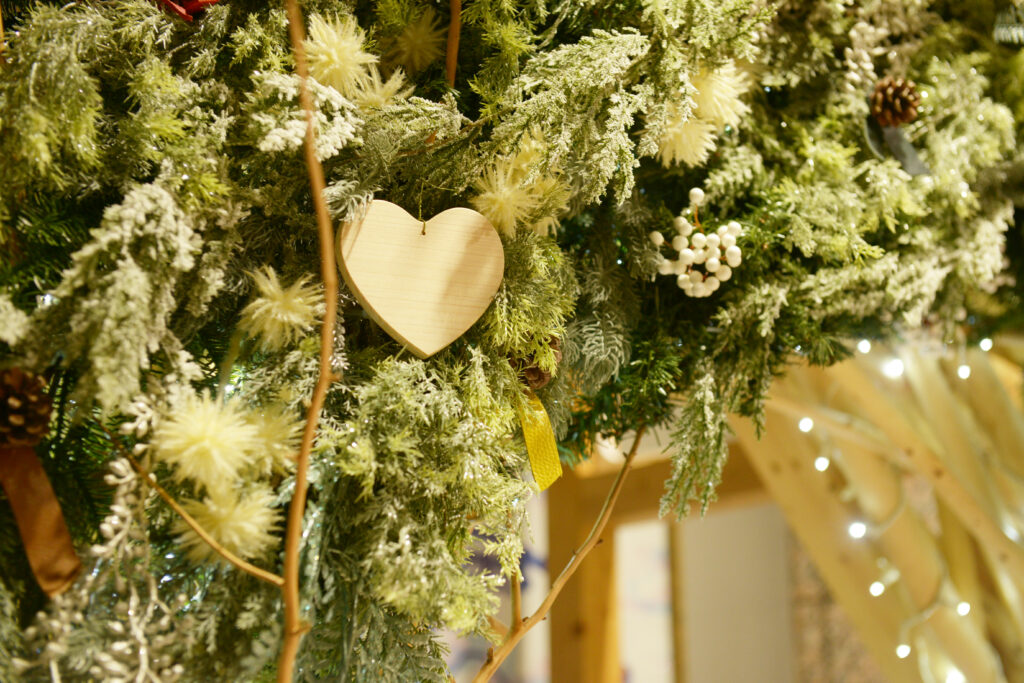 2021年に始まったヒノキの枝材で作ったクリスマスリースです。毎年、アートユニオン株式会社様がその年に合わせたデザインの飾り付けを行ってくださり使用いただいています。