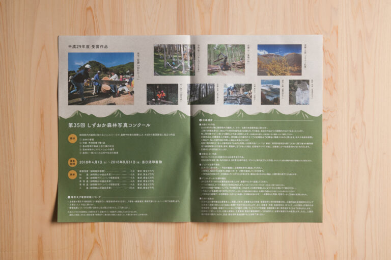 公益社団法人静岡県山林協会様主催の写真コンクールの募集案内をデザイン制作いたしました。募集要項のため情報量が多く、前年の受賞作品と情報を上下で分けて整理しました。