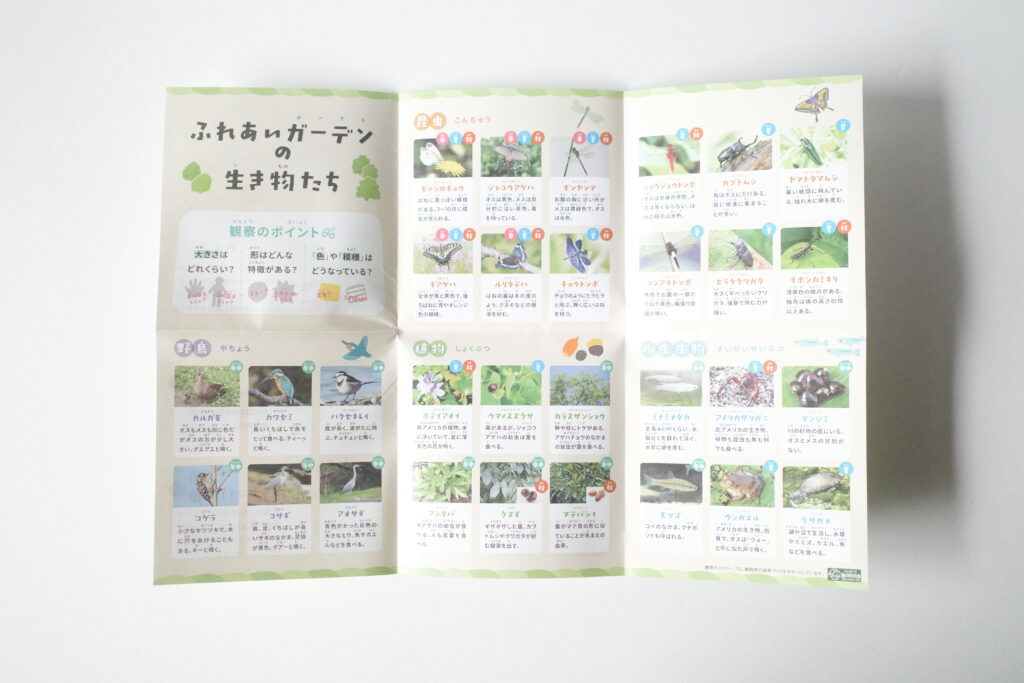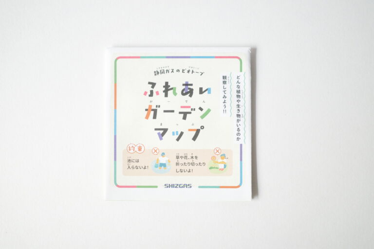 静岡ガス株式会社様の静岡支社にあるビオトープのマップを制作いたしました。一般の方が自由に出入りすることはできませんが、地元の幼稚園や学校がビオトープの観察に来られた際に配布するためのものとして制作させていただきました。そのため、漢字にはふりがなを付け、文字も大きめにしました。