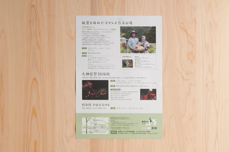 静岡市より依頼を受けて制作したフライヤーです。市より提供いただいた「てしゃまんく」のイラストを使用し、情報量が多い中、フォントや情報に動きを加えることでワクワク感や新たな風を吹き込む文化イベントであることを表現しました。裏面は同時開催される在来市場と大神楽祭のご案内になっています。