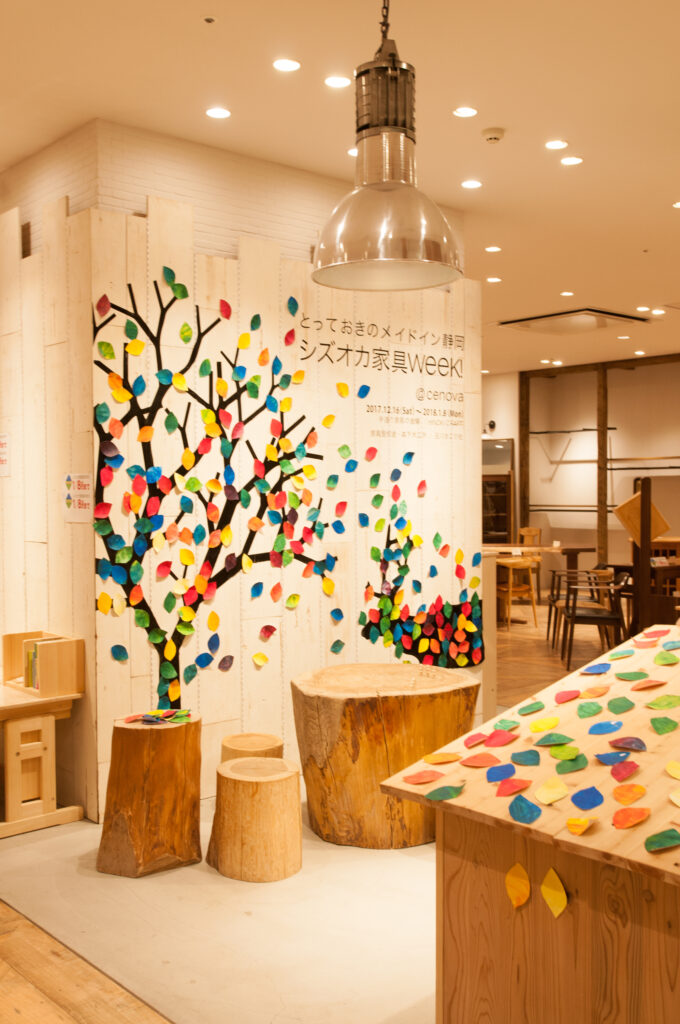 家具WEEK!で、静岡の家具メーカーがセノバに期間限定で出店したシズオカ家具WEEK!に参加させていただき、入り口部分の壁面の装飾を制作しました。ご来場いただいた方が、好きな色の葉っぱを壁面に貼ってもらうことで、木が彩り豊かになっていきます。隣のシカ含めたくさん貼っていただきました。 丸太の机と椅子も用意し、空間に森林を感じていただけたのではないでしょうか。