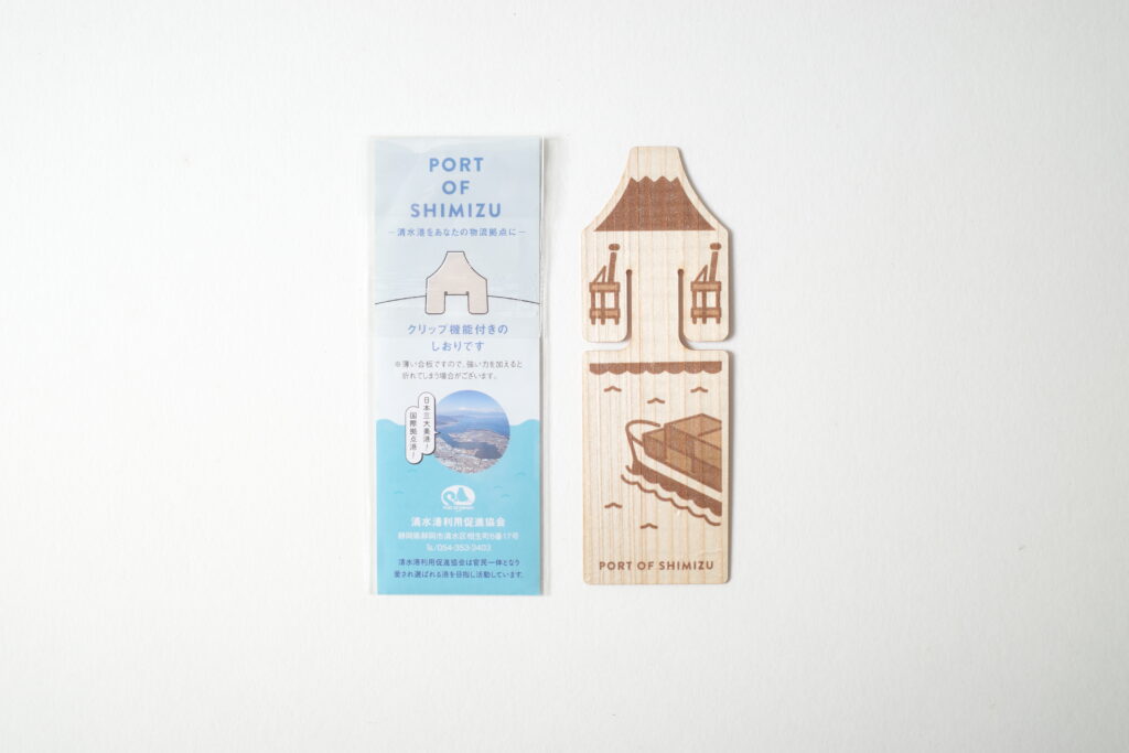 清水港利用促進協会様のノベルティとして、木製しおりをデザイン制作しました。クリップ機能が付いています。本を閉じると富士山が顔を出します。静岡県産の杉の合板で製作しています。