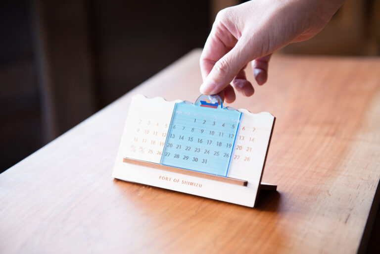 清水港利用促進協会様のノベルティとして万年カレンダーをデザイン制作させていただきました。コンテナ船が左右に行ったり来たりさせて使用します。アクリル板に薄いブルーを印刷して海を表現しました。カレンダーの数字等はレーザー彫刻で行いました。オリジナルの台紙を付けて個包装して納品いたしました。