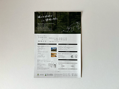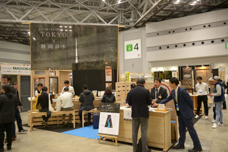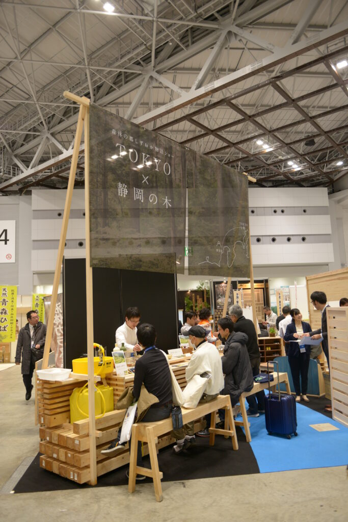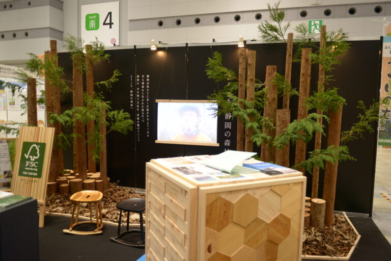 例年のモクコレを踏襲しつつ、本年はビジュアルカラーを黒に変更しました。静岡県は木材の生産から製材、加工まで行うことが可能であることを伝えるために、川上から川下をブース全体の床面のカーペットで表現。川上であるブースの奥には実際に森を製作しました。