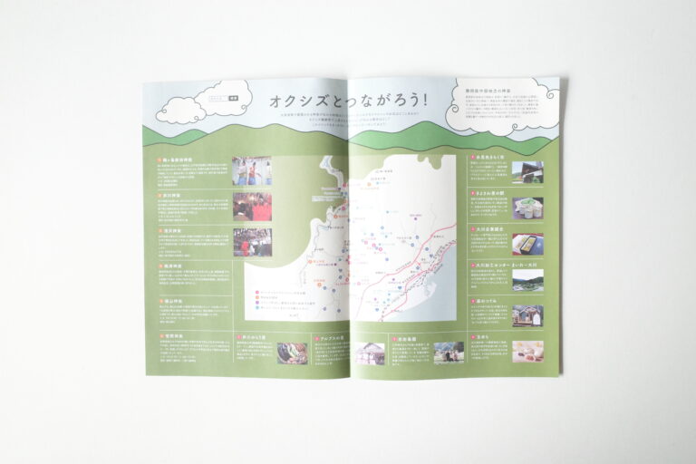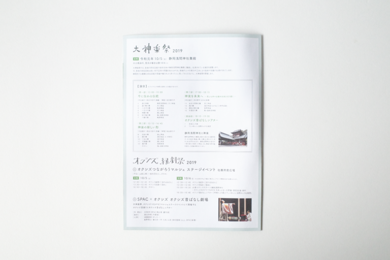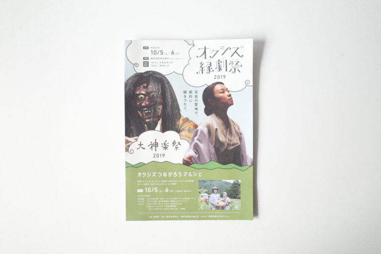 大神楽祭2019・オクシズ演劇祭2019のフライヤーを制作しました。大神楽祭に出演する地域やマルシェに出店するお店など、オクシズの位置関係を中面ではご紹介しています。提供画像でのデザイン制作でしたが、切り抜き写真にして目を引く表紙にできたと思います。