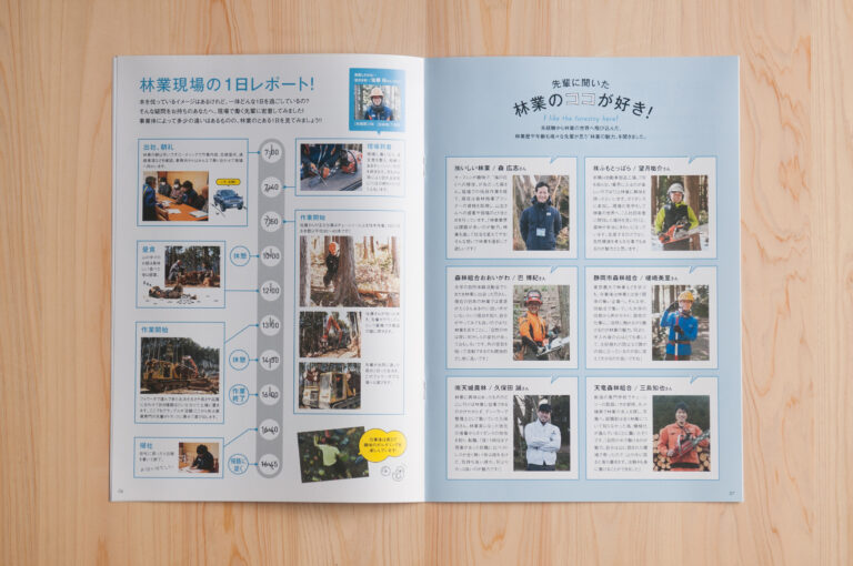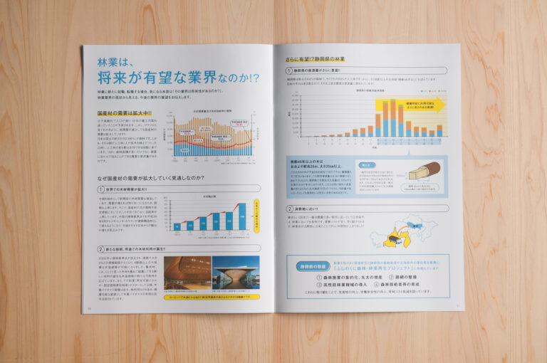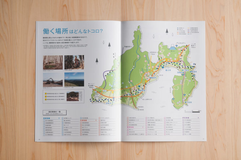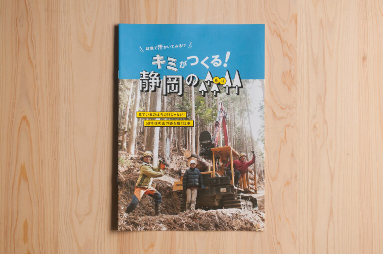 静岡県で林業従事者として働く人を増やすため、林業の仕事をPRするパンフレットを制作させていただきました。林業の仕事内容はもちろん、現役林業従事者の声を取材したり、林業の将来性について伝えるページも制作し、林業従事者になるとはどういうことかがこの一冊でわかる様に内容を組み立てました。