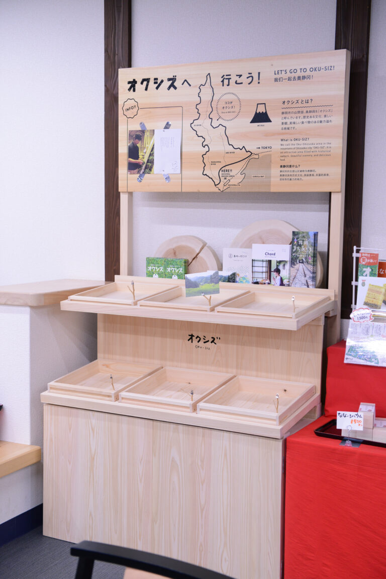 浅間神社の茶店内に設置する什器をオクシズ材で制作しました。什器上部にはオクシズのインフォメーション。インバウンドにも伝えられる様、英語と中国語でも案内文を表記。什器の下部にはストック品を収納できる様にしました。また、オクシズ関連のパンフレットを差し込める部分を作り、オクシズの商品が購入できるだけでなく、什器自体がオクシズの良さを伝えられる様に考えました。