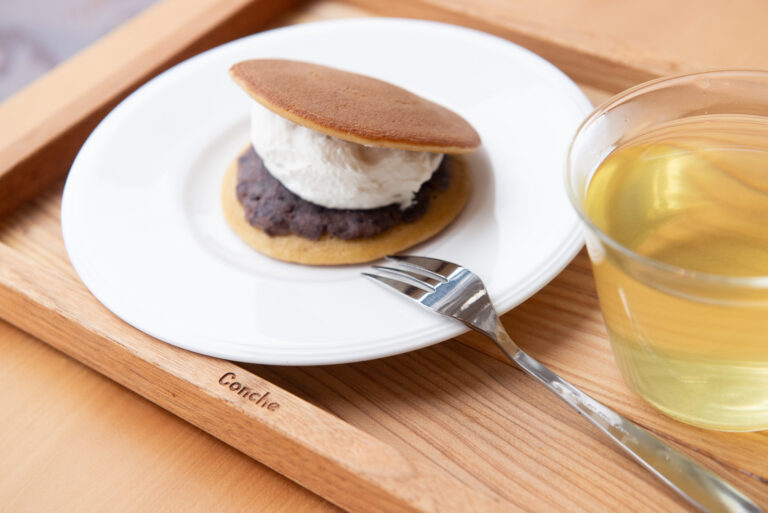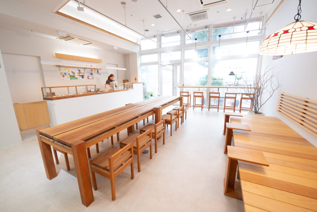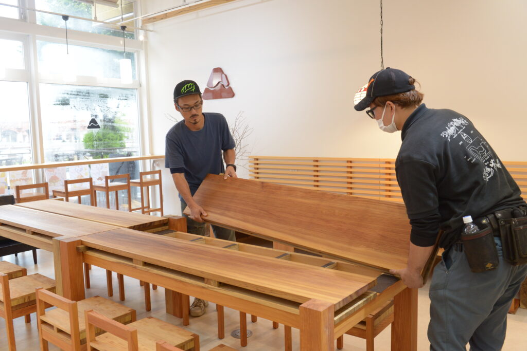 エスパルスドリームプラザ内の茶菓子屋Conche様の店舗内装、什器をデザインさせていただきました。メインのテーブルと椅子は樹齢300年の杉を片面に、もう片面はカシを使用し、リバーシブルで使える家具です。店内のサインは漆塗りで製作。茶菓子ご提供用のトレーなども製作いたしました。