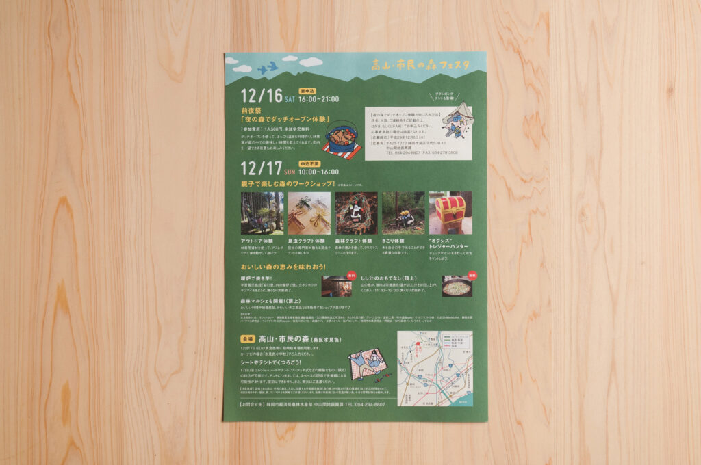 高山・市民の森10周年を記念したイベント「高山・市民の森フェスタ」のフライヤーを制作しました。安本奈々氏にイラストを描き下ろしていただき、ご家族で楽しめるイベントらしくポップなデザインに仕上げました。フェスタ当日は弊社もブースを出店させていただきました。