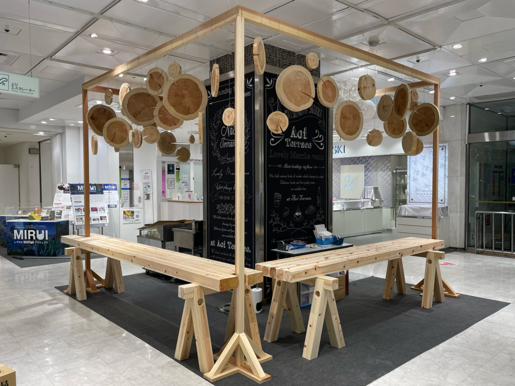 松坂屋静岡店Aoi Terraceのポップアップストアのディスプレイ什器を製作しました。丸太の輪切りを吊るし、温かみがありつつ可愛らしい空間にすることができました。丸太を吊るすための櫓はアートユニオン株式会社様がご用意くださいました。